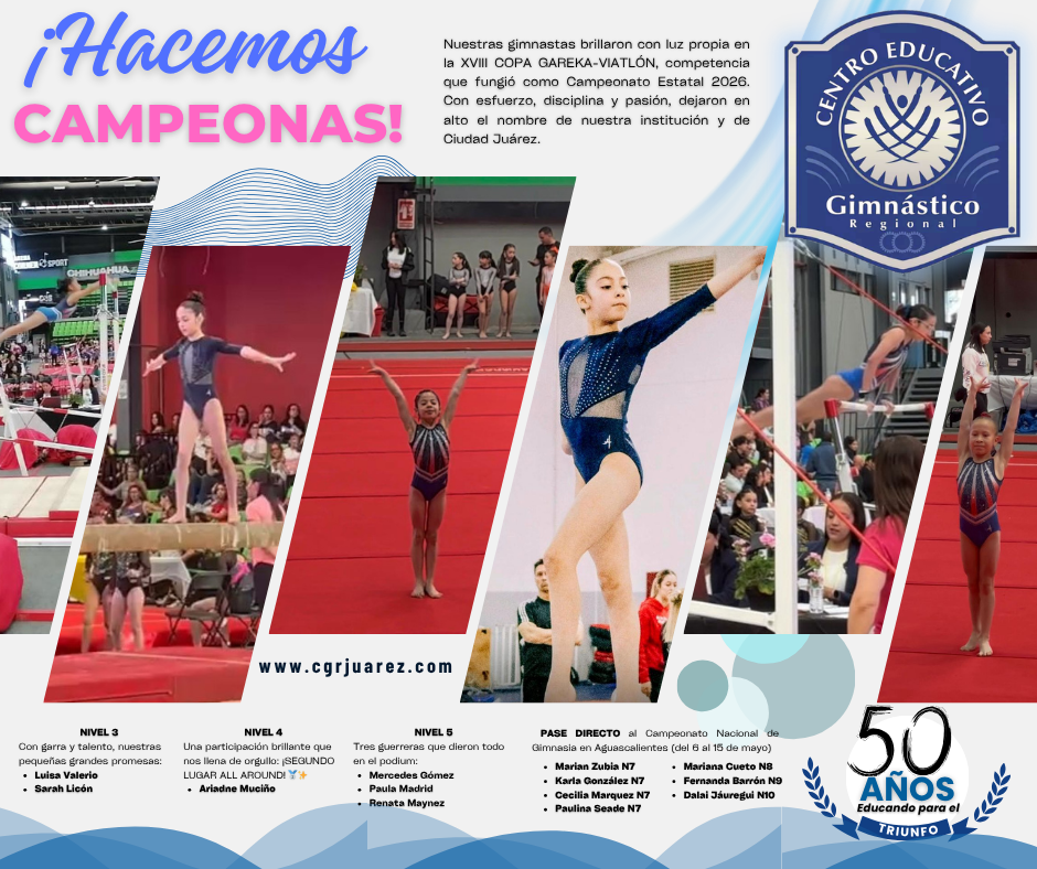 Nuestras gimnastas brillaron en el Campeonato Estatal. Luisa Valerio y Sarah Licon (N3); Mercedes Gómez, Paula Madrid y Renata Maynez (N5); y la brillante Ariadne Muciño con el 2do lugar All Around en N4, dejaron en alto el nombre del CGR.